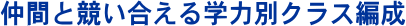 | 学力別クラス編成・教科別担任制・年3回のクラス分けと、生徒のそのときの学力に合わせ、1人ひとりに目が行き届く人数と、クラス編成を行います。 |