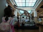 大きな恐竜の標本を、興味深そうに写真におさめる女の子。