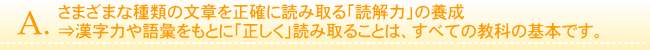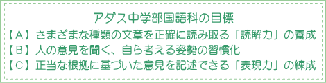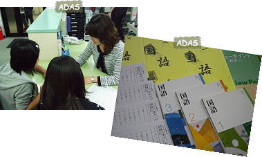 漢字に関する意識は非常に高くなっていますが、国語力低下の大きな原因は、不正確な黙読と貧弱な語彙にあります。文章を正しく読み取るための漢字力・語彙力をつけた上で、初見の文章を自分で「正しく」読み取る力は学問、生活の全ての場面でもっとも大切な力です。アダス中学部の国語は、初見の文章を正確に読み取るために必要な技術を「5w1h」「指示語」などのセクションに分け、段階的に定着させることで、確かな国語力を養います。