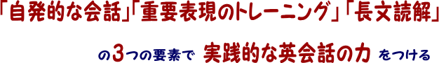 | 聞く・話すだけの活動だけで会話力は向上しません。一定量の英語を読むことも大事です。特に単語力や長い一文を理解する力は会話をする上でも必要です。200-300単語の文章を毎週一つ音読し、要約したり質問に答えたりします。意味のわからない単語は講師に質問します。講師は英語で答えますので英英辞書を使うのと同じです。 |