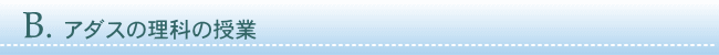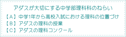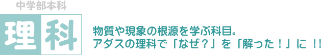 アダスの理科の授業では板書による説明にて、ピンポイントでテストに出る重要事項を教えていきます。また、それをノートに写してていくことで、そのノートが参考書代わりとなり、家庭学習をするとき、学校や塾の宿題をするとき、定期試験の勉強をするときに非常に役に立ちます。また理科では第一分野の化学・物理、第二分野の生物・地学のすべてに計算が入ってきます。この計算問題を解くには「数学が得意」なだけでは太刀打ちできません。理科の知識や理屈がわかっていないと解けないのです。アダス進学会ではテキストによる問題演習の他に、宿題やお帰りテストにより重要暗記事項や、公式を使用した計算問題の基本から応用までの定着を常に図っていきます。中3の理科の授業は集団指導を受ける生徒は全員必修とし、夏期講習より中3前期期末対策及び公立高校入試対策として中3の今までの復習並びに中1・中2の重要分野の総復習を行い、11月末までに中3の範囲を総て終了し、12月より入試対策授業を始めています。また、教科書の改訂によって削除された内容でも、中学生で必要な知識と思われるものは授業で教えていきます。