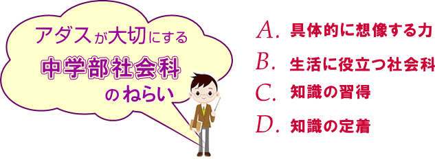 歴史の人物名や憲法の条文などを暗記することは重要です。しかし、覚えることが苦手という子ども達は少なくありません。アダスでは用語の暗記や定着がスムーズに行われるよう、段階をふんだ確認テストや問題演習、カリキュラムなど、「方法・内容」にもこだわります。また、小学部でのコンクールや他教科との連携により、中学校社会科に必要な基礎学力を養います。